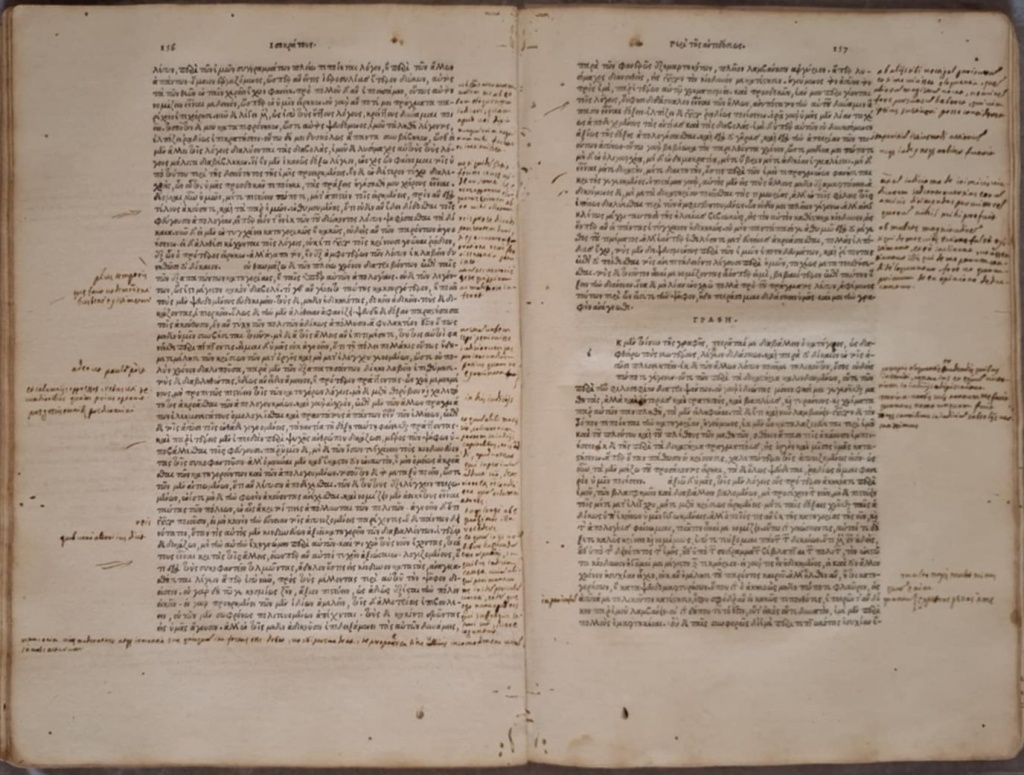 Το αντίτυπο είναι ακέφαλο (αρχίζει από την σελίδα 3). Το στοιχείο που το καθιστά μοναδικό είναι ότι φέρει διάσπαρτες παρασελίδιες σημειώσεις, -που συχνά καταλαμβάνουν όλο τον ελεύθερο χώρο γύρω από το εκτυπωμένο κείμενο – περισσότερες στα λατινικά και ορισμένες στα ελληνικά. Πρόκειται κυρίως για μετάφραση (τμημάτων) του ελληνικού κειμένου στα λατινικά, σχόλια στα λατινικά και μια απόδοση / περίληψη των λόγων στα ελληνικά.