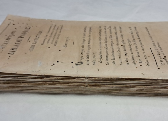 Ο βιβλιοδετημένος τόμος, ο οποίος εναπόκειται στη βιβλιοθήκη της Εταιρίας μας, προέρχεται από τη συλλογή του Στέφανου (Νάκη) Πιέρη και είχε υποστεί αρκετές φθορές στους δύο σχεδόν αιώνες που πέρασαν αφ’ ότου τυπώθηκαν τα φύλλα στο αγωνιζόμενο Μεσολόγγι.