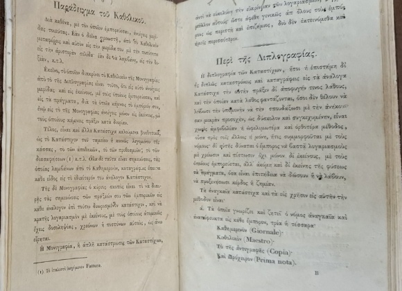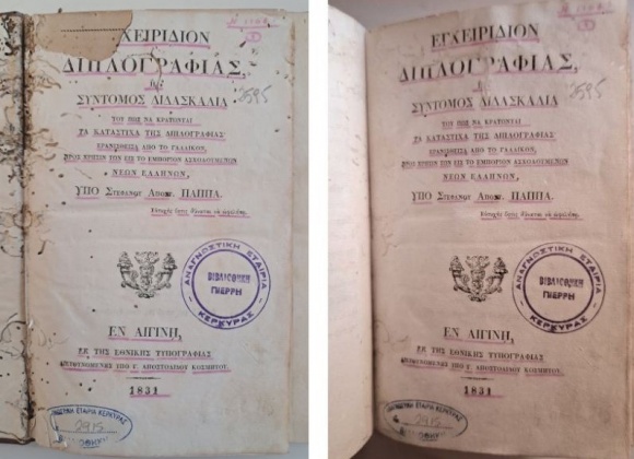 2.«ΕΓΧΕΙΡΙΔΙΟΝ ΔΙΠΛΟΓΡΑΦΙΑΣ, ή σύντομος διδασκαλία του πως να κρατώνται τα κατάστιχα της διπλογραφίας· ερανισθείσα από το γαλλικόν, προς χρήσιν των εις το εμπόριον ασχολουμένων ΝΕΩΝ ΕΛΛΗΝΩΝ, υπό Στεφάνου Αποστ. Παππά. ΕΝ ΑΙΓΙΝΗ, εκ της Εθνικής Τυπογραφίας, 1831».